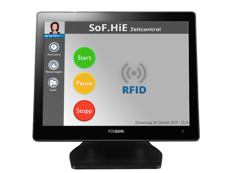 - Über einen Touchscreen erfolgt in Verbindung mit einem Scanner die An- bzw. Abmeldung eines Erntehelfers. Entweder durch den Betriebsausweis oder per RFID Chip