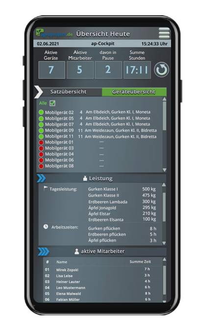 Die Live-Übersicht über das ap-Cockpit dient Ihnen als ideales Controlling-Instrument – automatisiert und ohne zusätzliche Personalkosten. Sie ermöglicht Ihnen jederzeit einen aktuellen Stand, was auf Ihrem Betrieb los ist. Die Geräteübersicht zeigt Ihnen alle aktiven und inaktiven Geräte, angemeldete Mitarbeiter und Tagesleistungen. So haben Sie stets eine aktuelle Übersicht Ihrer Sätze mit den für Sie wichtigen Informationen.